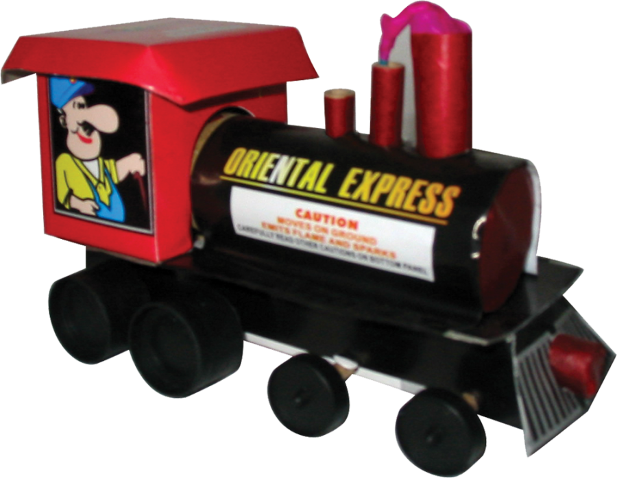 This train is a popular item with the kids. It begins with whistling mixed with a colorful barrage of red and green pearls into the air. This is followed by an explosion of white flittering flowers and finished up with a loud whistle from its horn.
