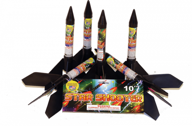 10″ high quality well designed plastic missile. Flies up over 100 feet and bursts to a colorful peony and crackling stars. Each case comes with 16 packs of missiles with 6 pieces in each pack. These popular items can be sold individually or by the pack. The Star Shooter has been the one selling missile for four years running.